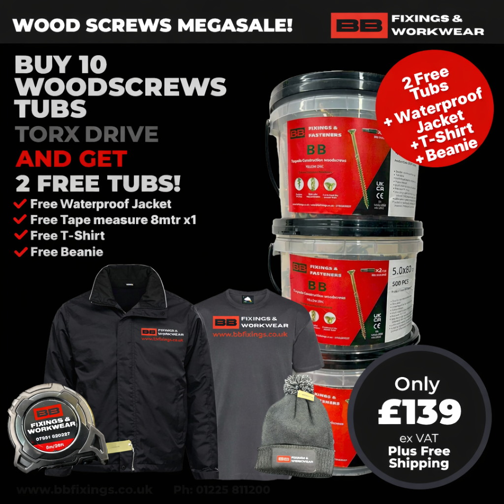 BB Torpedo woodscrews 4mm x 25mm – (Quantity 2500), BB Torpedo woodscrews 4mm x 30mm – (Quantity 1600), BB Torpedo woodscrews 4mm x 40mm – (Quantity 1200), BB Torpedo woodscrews 4mm x 50mm – (Quantity 1000), BB Torpedo woodscrews 4mm x 60mm – (Quantity 800), BB Torpedo woodscrews 4mm x 70mm – (Quantity 700), BB Torpedo woodscrews 5mm x 40mm – (Quantity 800), BB Torpedo woodscrews 5mm x 50mm – (Quantity 750), BB Torpedo woodscrews 5mm x 60mm – (Quantity 700), BB Torpedo woodscrews 5mm x 70mm – (Quantity 600), BB Torpedo woodscrews 5mm x 80mm – (Quantity 550), BB Torpedo woodscrews 5mm x 90mm – (Quantity 500), BB Torpedo woodscrews 5mm x 120mm – (Quantity 300), BB Torpedo woodscrews 6mm x 100mm – (Quantity 250), BB Torpedo woodscrews 6mm x 120mm – (Quantity 225), BB Torpedo woodscrews 6mm x 150mm – (Quantity 200)