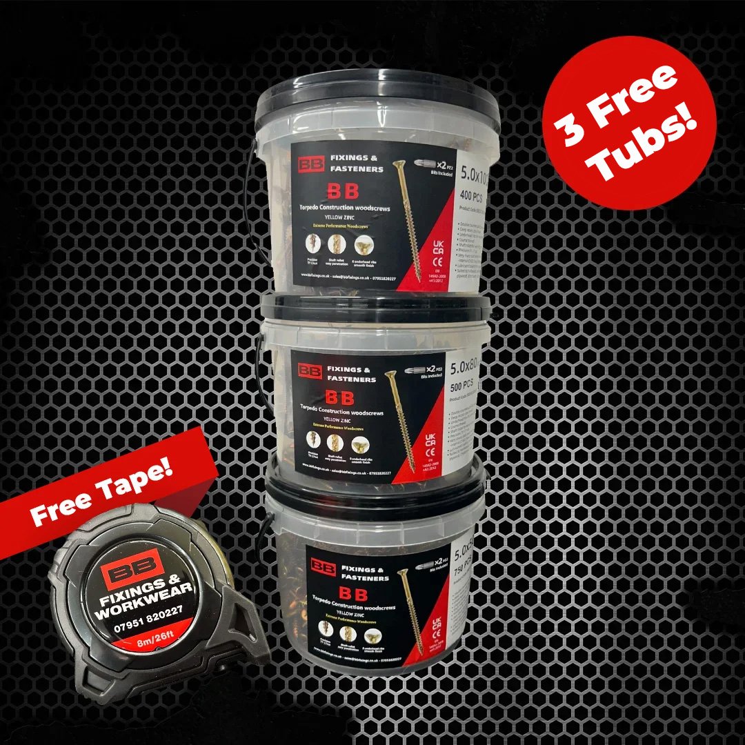 BB Torpedo woodscrews 4mm x 25mm – (Quantity 2500), BB Torpedo woodscrews 4mm x 30mm – (Quantity 1600), BB Torpedo woodscrews 4mm x 40mm – (Quantity 1200), BB Torpedo woodscrews 4mm x 50mm – (Quantity 1000), BB Torpedo woodscrews 4mm x 60mm – (Quantity 800), BB Torpedo woodscrews 4mm x 70mm – (Quantity 700), BB Torpedo woodscrews 5mm x 40mm – (Quantity 800), BB Torpedo woodscrews 5mm x 50mm – (Quantity 750), BB Torpedo woodscrews 5mm x 60mm – (Quantity 700), BB Torpedo woodscrews 5mm x 70mm – (Quantity 600), BB Torpedo woodscrews 5mm x 80mm – (Quantity 550), BB Torpedo woodscrews 5mm x 90mm – (Quantity 500), BB Torpedo woodscrews 5mm x 100mm – (Quantity 450), BB Torpedo woodscrews 5mm x 120mm – (Quantity 300), BB Torpedo woodscrews 6mm x 100mm – (Quantity 250), BB Torpedo woodscrews 6mm x 120mm – (Quantity 225), BB Torpedo woodscrews 6mm x 150mm – (Quantity 200)