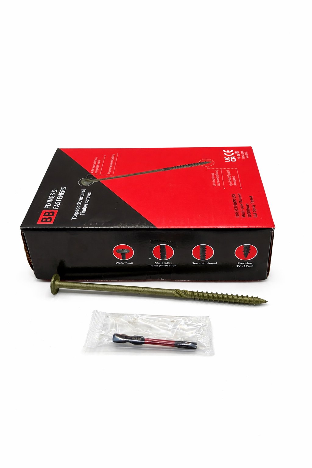 Torpedo Structural Wafer head Timber screws, Torx Driver, Knurled on Shank, Serrated thread, Quick star Type 17 slash point, Multi-layer Ruspert 1000Hours Salt Spray Tested, box packing , 1pc impact bit per box